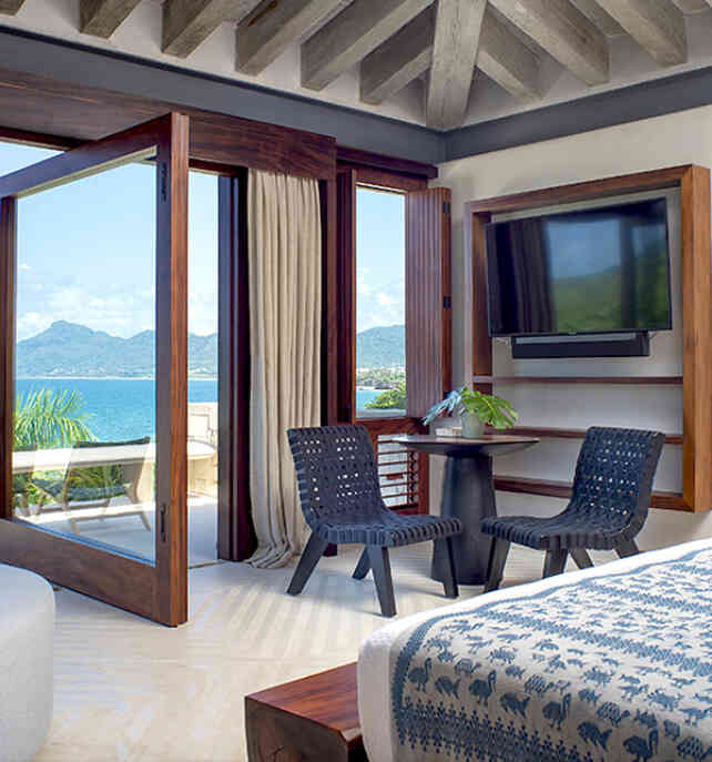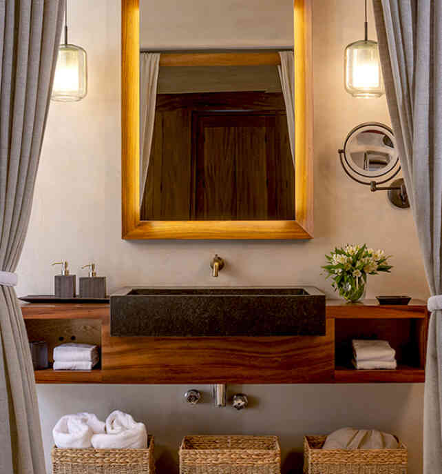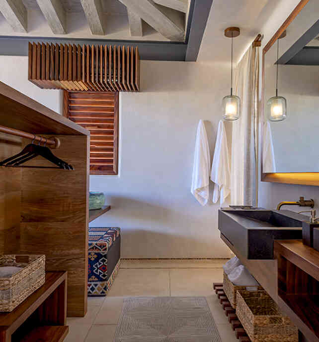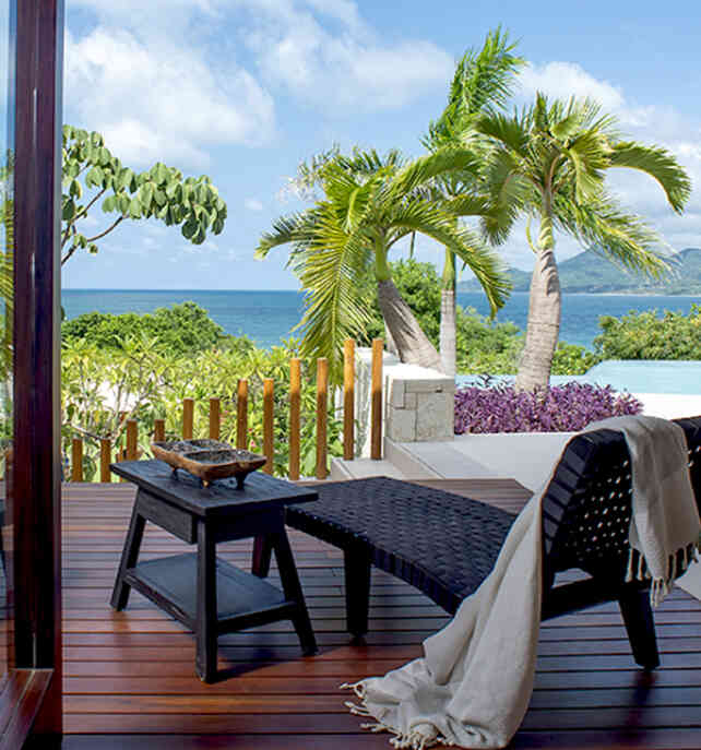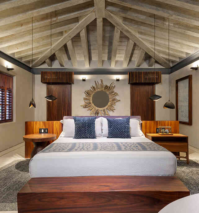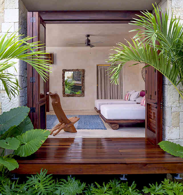 mientras un exuberante jardín con bar al aire libre te lleva a tu cabaña privada en la playa.